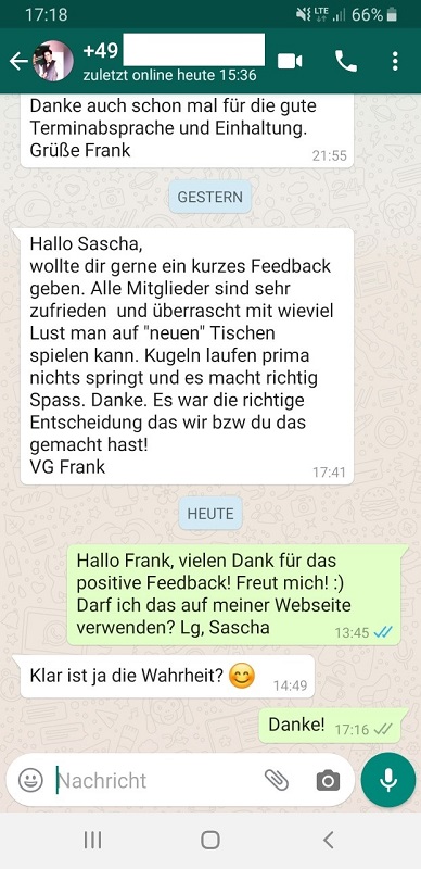 Sascha Lippe ist zuverlässig, pünktlich und freundlich, die Kommunikation hat sehr gut funktioniert und wir sind sehr zufrieden mit seiner Arbeit. Man merkt, dass er nicht nur ein Tablefitter, sondern auch ein hervorragender Spieler ist und deshalb sehr viel Wissen hat, was Snooker und Poolbillard betrifft. Das gibt seiner Arbeit den letzten Schliff.