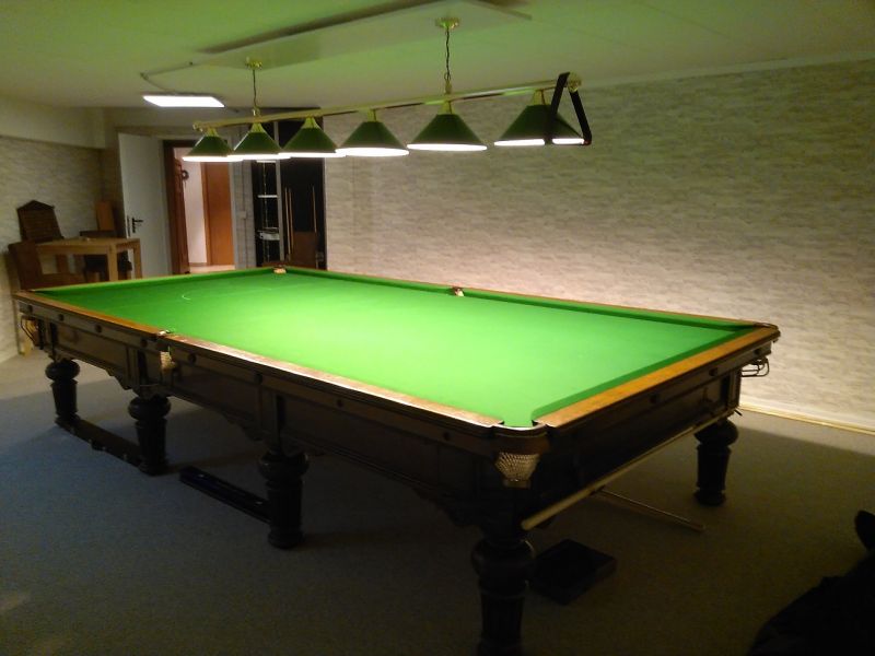 Herzlichen Dank an Sascha und Rolf für die Lieferung und den Aufbau eines Ebay gekauften 12 Fuß Snooker Tisches! Nach einigen Schwierigkeiten ist der Tisch endlich fertig aufgebaut bei mir zu Hause. Ich würde im Nachhinein eher von einem ebay Kauf abraten, nur in meinem Fall habe ich genau so einen Tisch über Monate hinweg gesucht und schließlich gefunden: Nämlich einen antiken Burroughs&Watts Mahagoni Tisch, jedoch komplett getrimmt auf Match Qualität, match cut pockets, Riley steel block Banden und No. 10 Tuch.