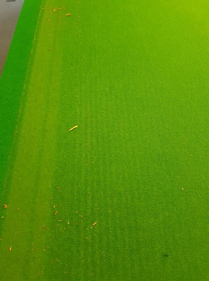 Denn beim Bürsten und Blocken, egal wie eifrig man ist, bürstet man viel Kreide UNTER das Tuch. Feine Kreidepartikel fallen auch während des Spiels durch die Fasern des Tuches und liegen dann unter dem Tuch. Was irgendwann so viel sein kann, das es durch die Hitze beim Bügeln das Tuch sogar angreift und matt macht.